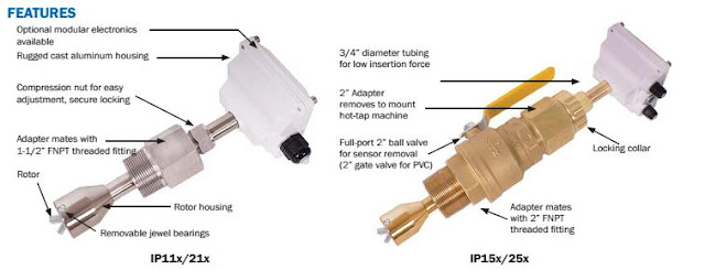 The IP100/200-Series are adjustable depth insertion paddle wheels that come in brass, PVC, or 316 stainless models to fit 3” to 40” pipe. Adapters mate with standard 1-1/2” (11x/21x) or 2” (15x/25x), or PVC (11x/21x) NPT threaded fi ttings such as saddles and weldolets which may be purchased either locally or from Seametrics.