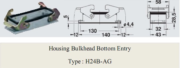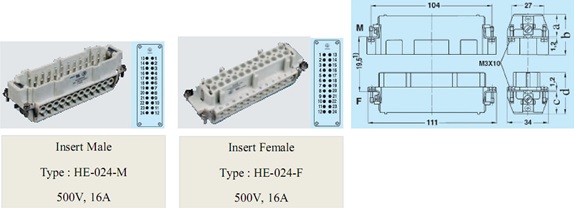 Heavy Duty Connector Sibas Type HE 024 Heavy Duty Connector Sibas Type HE 024 Spesifikasi secara umum untuk series ini antara lain : Insert Terminal :Â Â Â Rated Current : 16 Ampere Rated Voltage : 500 V Insert Hood Housing Product