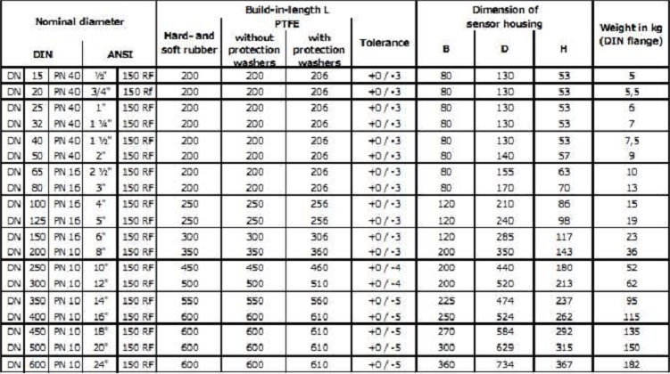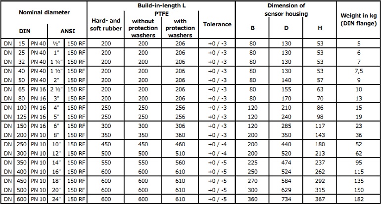 Sensors with soft rubber/neoprene lining are only available from nominal diameter DN 25mm (1″).